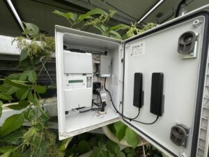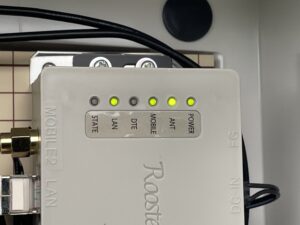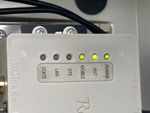 発電監視機器が収納されているボックスを開けて、本体を確認すると電源は入っていましたが表示ランプの状態からデータ通信が止まっているようです。