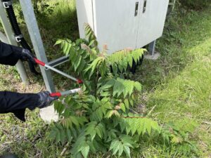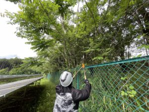 画像は発電施設周囲のフェンス外から越境して敷地内に伸びてきた木の枝を切っているところです。