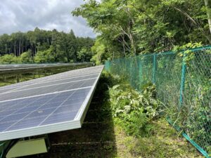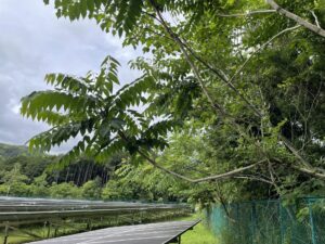 発電所建設時には短かった木も時間の経過と共に大きくなり、伸びた枝葉はソーラーパネルに影を作ったり木から落ちる樹液でパネルも汚れ発電に悪影響が出てしまいますので、定期的に伐採しています。