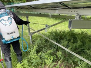 一般的に草刈りのみでは地面下に草の茎や根が残り、1ヶ月ほど経過するとまた大きく伸び、ソーラーパネル前面に草がかかってしまったり、定期メンテナンス作業に支障が出たりもします。
