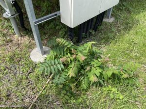 接続箱や設備周辺に伸びた短い雑草や笹も定期点検時の支障になりますので電気ケーブルに注意しながら刈り込みバサミを使い除草させていただきます。