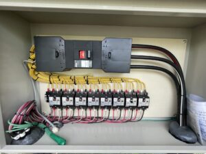 集電箱内を見ると停止パワコンと接続されているブレーカーが遮断しており、何らかの原因でブレーカー遮断が起きたことで同じ電路のパワコンも停止したようです。