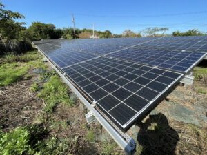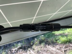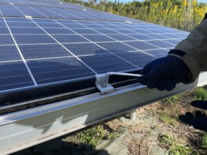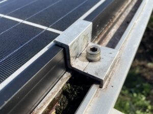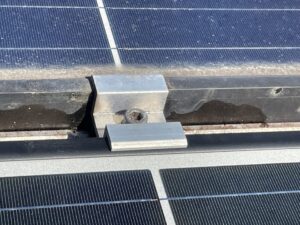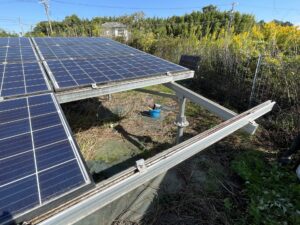 まずは割れたソーラーモジュールの固定金具を緩め架台から取り外し、新しい交換用モジュール取り付け準備をしていきます。